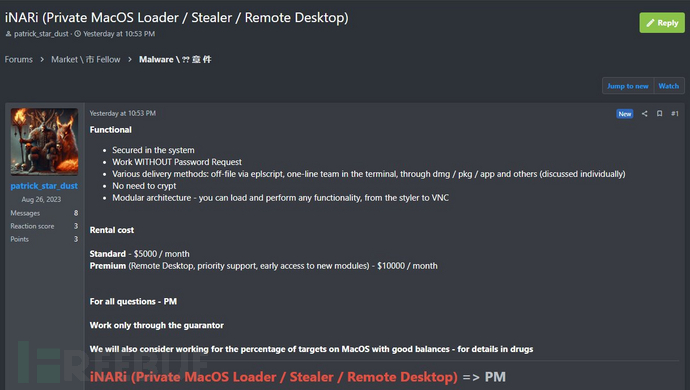 网络安全领域出现了一种针对苹果用户的警惕件新型威胁。地下论坛上正在宣传一款名为"iNARi Loader"的黑客macOS恶意软件即服务(MaaS)产品。