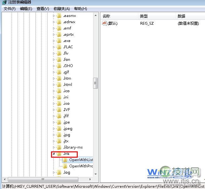 2、然后打开的注册表编辑器中依次定位到“HKEY_CURRENT_USER//SOFTWARE//MICROSOFT//WINDOWS //currentversion//Explorer//FileExts//.lnk”项;
