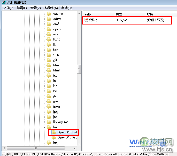 4、然后分别展开“openwithlist”和“openwithprogids”项之后,在窗口右侧中将除默认键值以外的所有键值也都删除掉,点击确定按钮保存退出注册表即可。