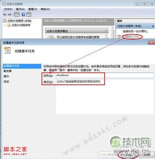 接着打开这个工具,置自骤会弹出“任务计划程序”窗口,动关单击右侧的机步“创建基本任务…”命令,就打开了“创建基本任务向导” 对话框。用任在“名称”文本框中,划程输入该任务计划的序设名称:shutdown,并在“描述”一栏中写上“让Windows 7系统按照设定的时间自动关机”再单击“下一步”按钮。以上操作见下图: