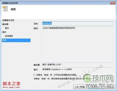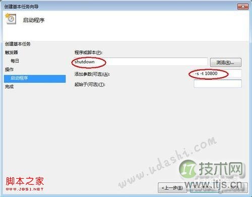 在接下来的“操作”步骤中,选择“启动程序”单选项,单击“下一步”按钮;会再次弹出一个窗口,IT技术网这时在“程序或脚本“框中输入”shutdown命令,记住这里不要输入错误;然后在”添加参数“一栏输入你需要的参数,如”-s –t 10800“注意这里的时间是以秒为单位的;上面表示三小时后电脑将自动关机,再单击”下一步按钮“;