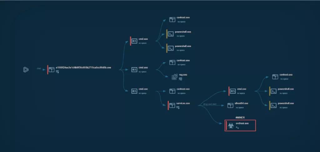 原因之二,是该病毒具有较为完善的躲避检测的方法。分析显示,该文件在执行后,会立即创建调度作业名为 services 注册机码,以保证自身持久性,之后它将删除用户系统中的合法文件,并创建名为 sihost64.exe 和 svchost.exe 文件进行冒充,其中 sihost64.exe 为 watchdog 进程,用于监控程序运行,而 svchost.exe 即为挖矿文件。同时,该程序还能够通过两个 powershell 命令,向 Microsoft Defender 的例外清单加入以下扩展排除项:忽略用户配置文件下的所有文件夹、系统驱动器、以及扩展名为".exe"或".dll"的所有文件。以此躲过微软的杀毒工具与系统管理器的侦测。