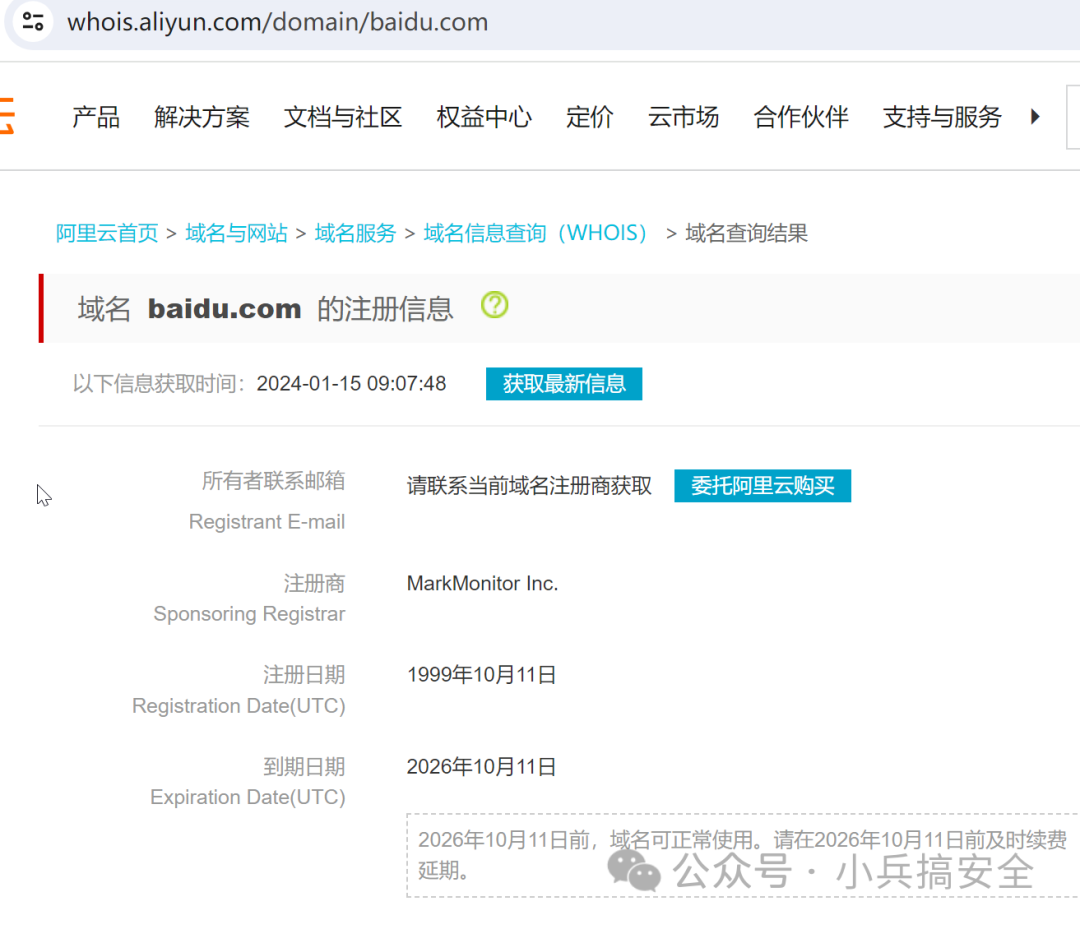 打开阿里云WHOIS查询页面:https://whois.aliyun.com/,在搜索框中输入目标域名,点击“查询”按钮。等待查询结果展示,即可查看域名的注册信息、联系人、DNS服务器等。