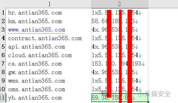 如图所示,可以看到两列数据,第一列为域名,第二列是域名对应的解析IP地址。