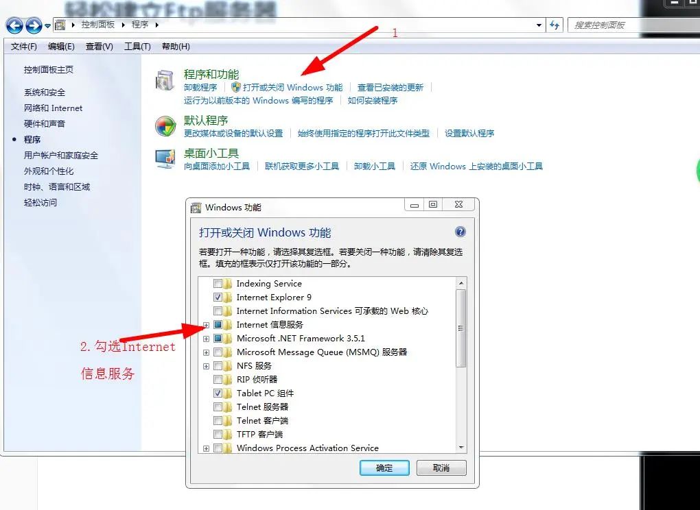 按照图中的操作即可打开。然后开启Internet信息服务下的所有功能: