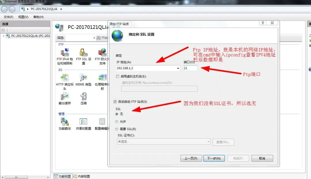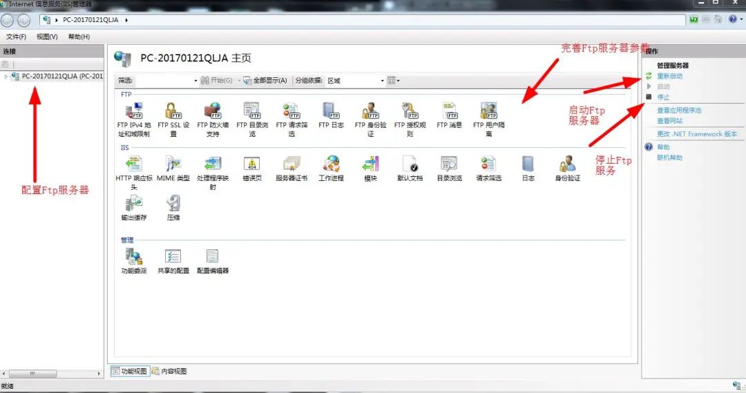 首先我们右击我们的计算机名那一栏,也就是PC-20170121QLJA,然后选择添加Ftp站点,进入如下界面: