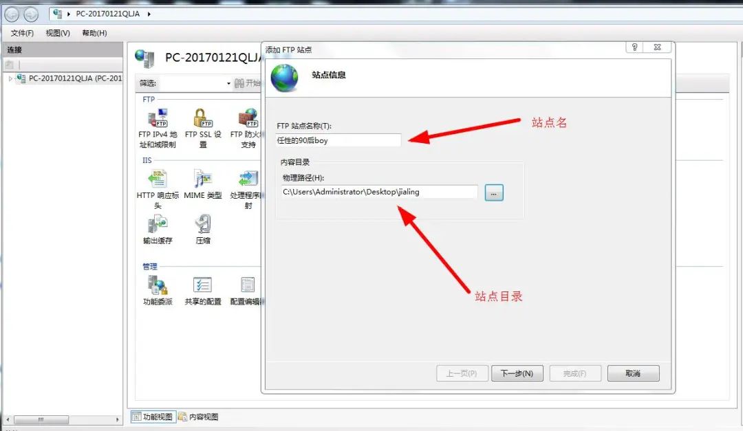 设置Ftp站点名和Ftp服务器所指物理路径,然后点击下一步: