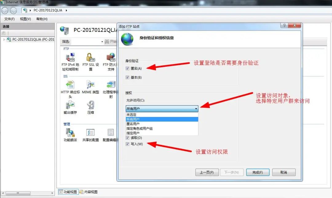 然后设置Ftp的身份验证和访问对象以及访问权限设置。设置好后点击完成即可启动Ftp服务器。