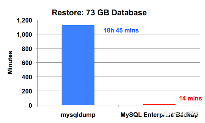 第二张图比较的是恢复时间,mysqldump是mysqlbackup的80倍。