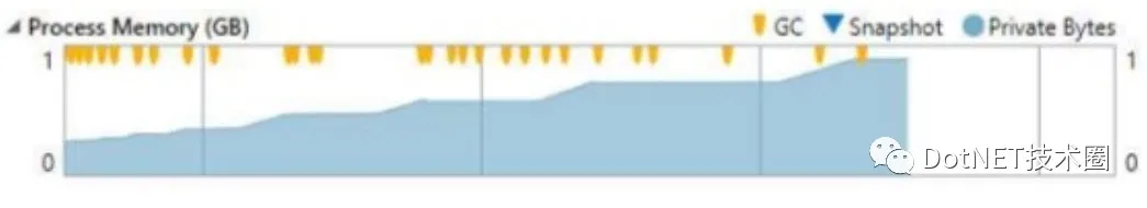 要了解您是否有严重的内存泄漏,请查看一段时间内的内存消耗图表(进程 | 私有字节计数器)。如果内存一直在增加,而没有偏离某个水平,则可能存在内存泄漏。